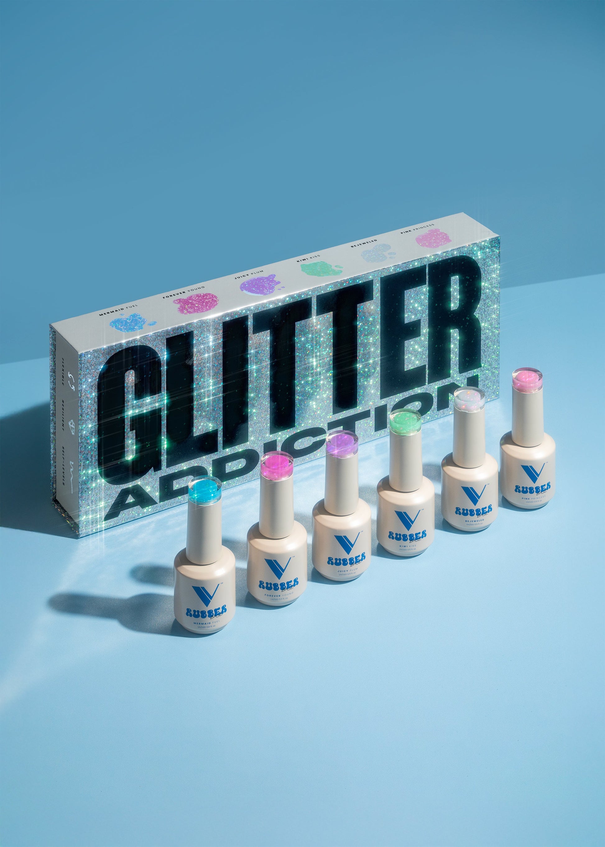 Glitter Addiction Rubber Base Collection is extremely flexible and intended for your short nail styles. 6 colors.